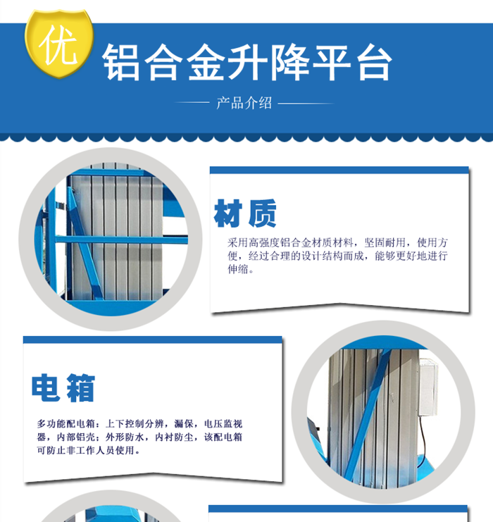 鋁合金升降平臺:形式多樣化,滿足個行業也的使用需求。鋁合金型材是工業中應用廣泛的一類有色金屬結構材料,也正在逐漸的代替了鋼鐵,很多人都覺得使用鋁合金型材不僅性價比高,而且使用起來外觀也非常好看。這個跟鋁合金型材的特性有密不可分的關系,鋁合金型材抗腐蝕,使用壽命長,所以性價比高,表面可做不同的處理,組裝成框架看上去美觀。在航空、航天、汽車、機械制造、船舶及化學工業中已大量應用。